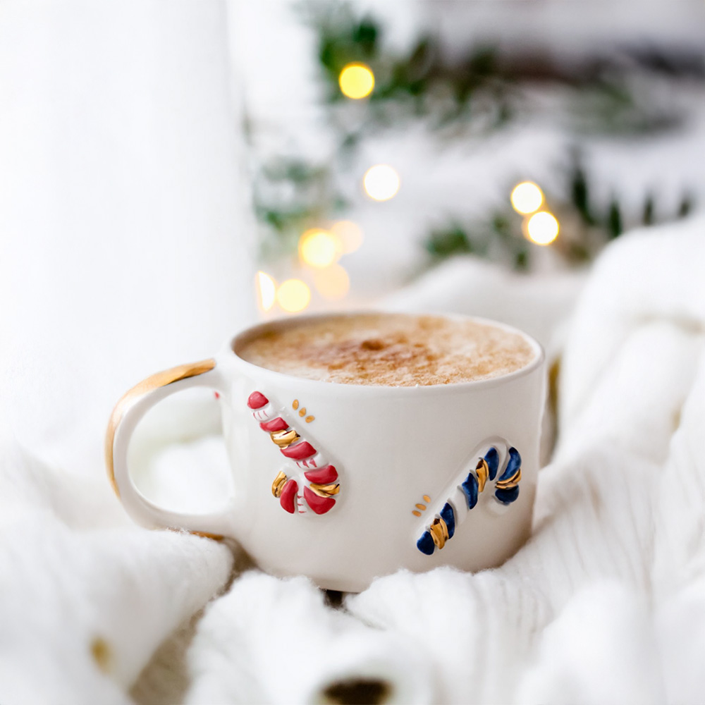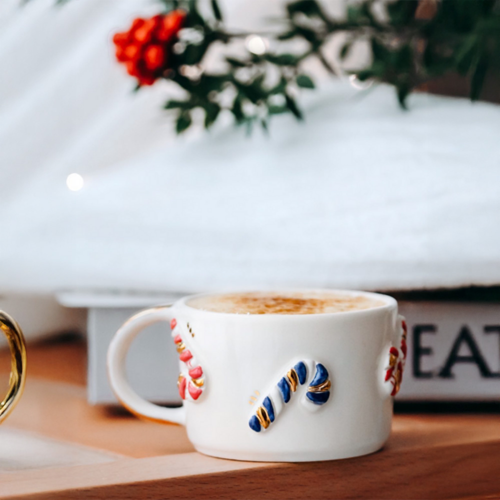 Gerçek Altın Detaylı El Yapımı Yılbaşı Candy Cane Seramik Mug Kupa